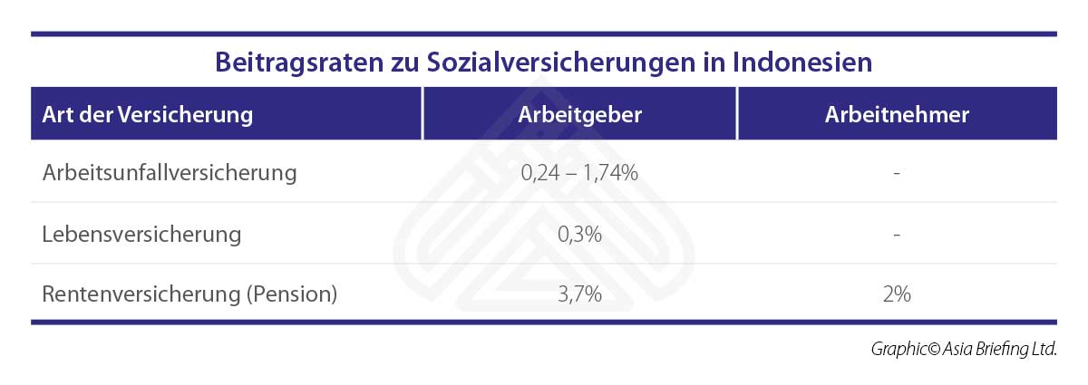 In Indonesien wird das Sozialversicherungsprogramm von der Sozialversicherungsorganisation des Landes oder der Badan Penyelenggara Jaminan Sosial (BPJS) in Zusammenarbeit mit dem Arbeitgeber organisiert. Die Beitragssätze sind wie folgt:
