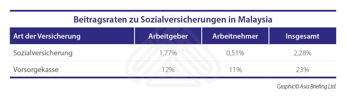Sowohl Arbeitgeber als auch Arbeitnehmer müssen über den Malaysia’s Employees‘ Provident Fund (EPF) und die Social Security Organization (SOCSO), welche Rente, Arbeitsunfähigkeit, Lebensversicherung und medizinische Leistungen beinhalten, zu einem Sozialversicherungsprogram beitragen. Hausangestellte, ausländische Arbeiter, Selbstständige und Ehepartner von Selbstständigen sind von den Beitragszahlungen an die EPF sowie an die SOCSO befreit.