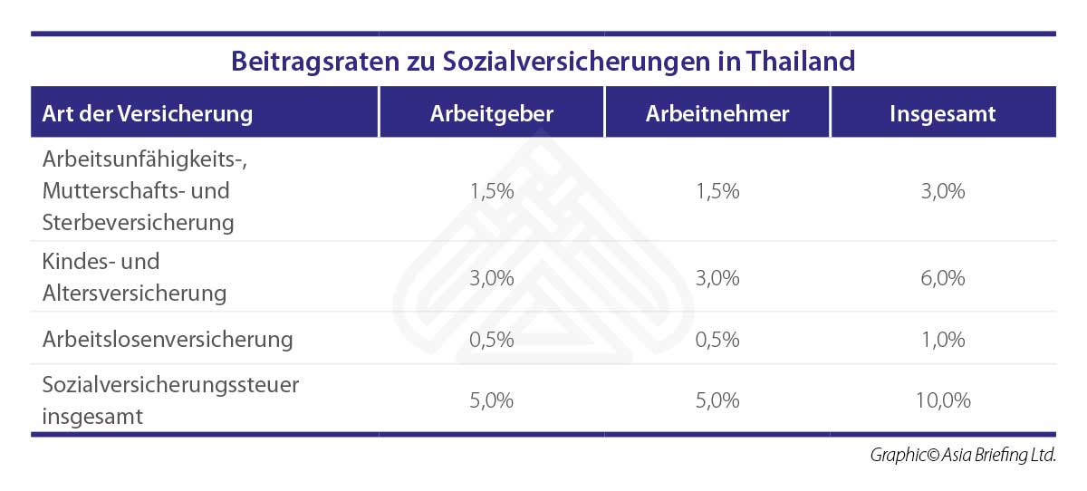 Arbeitgeber müssen ihre Arbeitnehmer bei dem Workmen Compensation Fund und dem Sozialversicherungsfond anmelden. Sowohl Arbeitgeber als auch Arbeitnehmer müssen einen Beitrag in Höhe von 5 Prozent des Gehalts des Arbeitnehmers, maximal jedoch 750 THB (23 USD) pro Monat, zum Sozialversicherungsfond leisten.