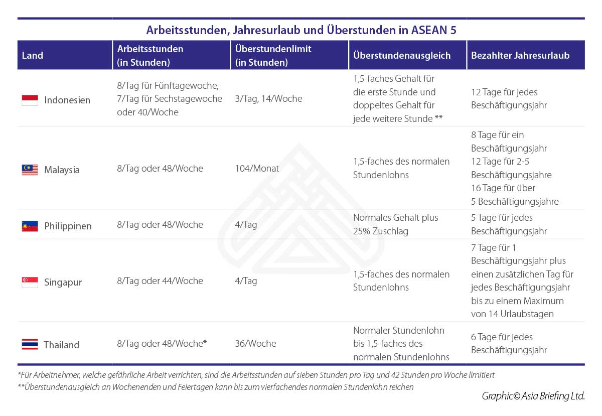 Dieser Artikel, welcher am 26. Oktober 2018 aktualisiert wurde, wurde am 13. September 2018 erstveröffentlicht. Er ist ein Auszug aus der Juli-Ausgabe 2018 des ASEAN Briefing-Magazins mit dem Titel „Managing Contracts and Separation in ASEAN“. In dieser Ausgab des ASEAN-Briefing Magazins diskutieren wir, wie Verträge und Kündigungen in den fünf wirtschaftsstärksten Staaten des ASEAN-Raums, Indonesien, Malysia, Philippinen, Singapur und Thailand, verwaltet werden. Zunächst stellen wir die wichtigsten Merkmale von Arbeitsverträgen und Sozialversicherungspflichten vor. Anschließend diskutieren wir die verschiedenen, mit der Kündigung von Mitarbeiter zusammenhängenden, Anforderungen an den Arbeitgeber und abschließend die aktuellen Mindestlohnsätze in ASEAN.