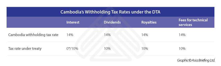 Cambodia has reduced the withholding tax rate on interest, dividends, royalties, and fees for technical services for Hong Kong residents, as seen in the table below.