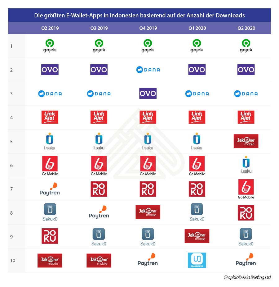 Lokale Anbieter dominieren immer noch den Markt (über 30), und GoPay, OVO, Dana und LinkAja sind einige der Spitzenreiter in der Branche. 58 Prozent der Verbraucher nutzten GoPay, ein E-Wallet, das vom lokalen Decacorn Gojek entwickelt wurde. Das Unternehmen hat sich mit der Bank Jago zusammengetan, um seine E-Wallet-Dienste zu entwickeln. Diese hatten im Jahr 2020 einen Bruttotransaktionswert von 12 Milliarden US-Dollar. GoJek sammelte 1,2 Mrd. US$ an Kapital, um es mit dem Rivalen Grab aufzunehmen. Das Unternehmen befindet sich außerdem in Gesprächen mit dem lokalen E-Commerce-Riesen Tokopedia im Hinblick auf eine mögliche Fusion in Höhe von 18 Milliarden US-Dollar.