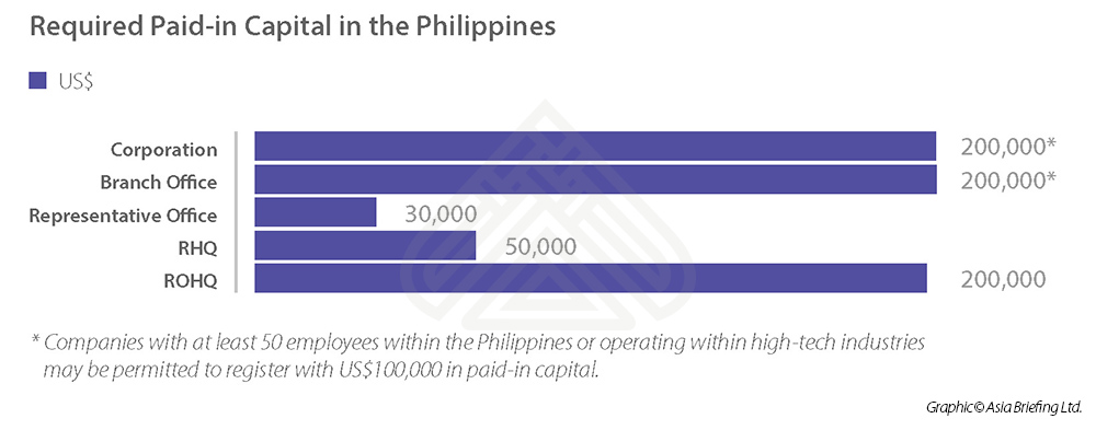 Foreign-owned domestic corporations serving the Filipino market require a minimum of five shareholders and at least US$200,000 of paid in capital. The paid in capital can be reduced to US$100,000 if the corporation is involved in advanced technology or employs 50 direct employees. If the corporation is an ‘export market enterprise’ – defined as exporting at least 60 percent of its goods or services – the required capital is reduced significantly to P5000 (US$ 100).