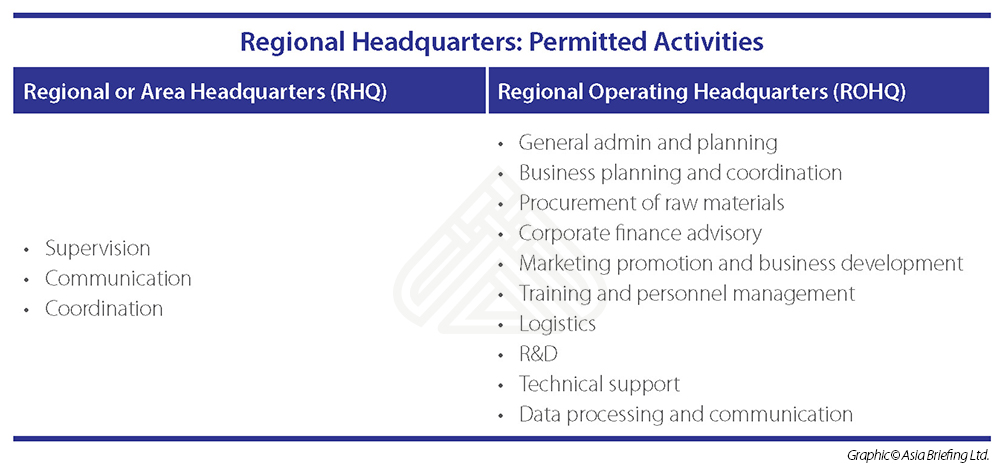There are two distinct types of regional headquarters: Regional or Area Headquarters (RHQ) and Regional Operating Headquarters (ROHQ). The graphic below shows what operations are legally allowed for both RHQs and ROHQs.