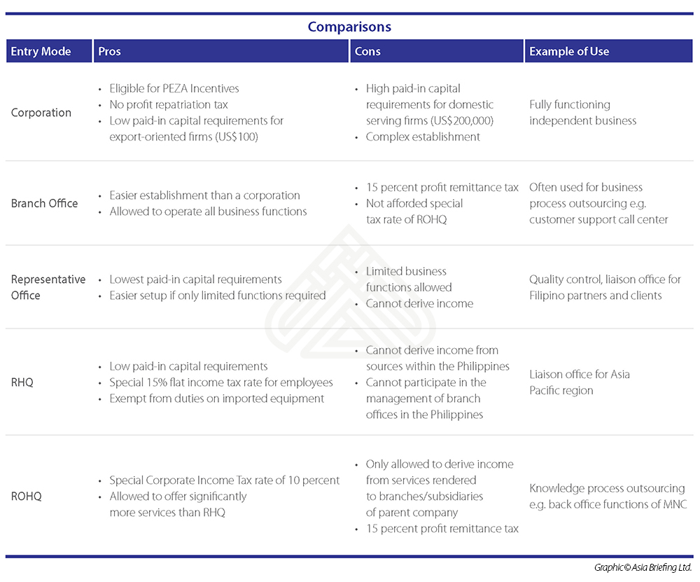 There are a range of entry modes to choose from when investing in the Philippines. Each one is governed by different rules and, as such, each is suitable for different functions and business models. Below, the four main methods of entry are outlined.