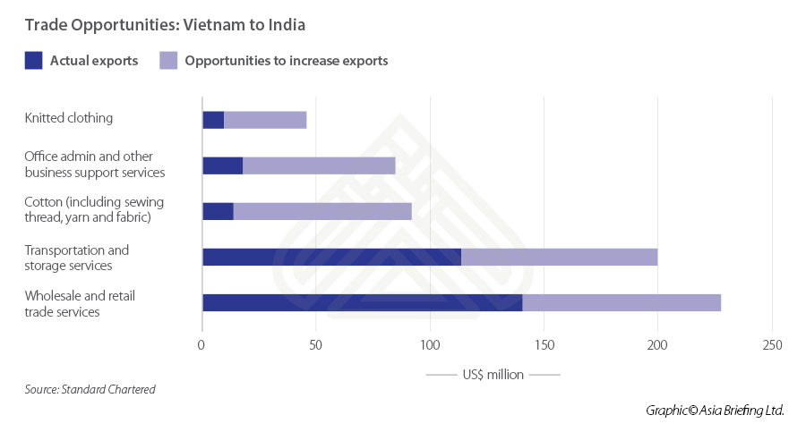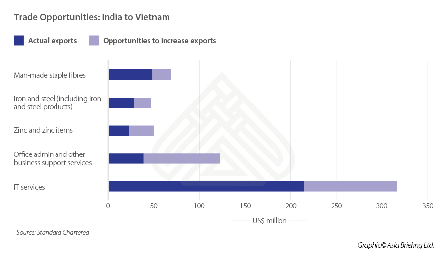 India has enormous growth potential to provide IT and business services, zinc, steel, and fibers to Vietnam. Vietnam’s exports to India have a remarkable scope to increase in cotton, business support, and knitted clothing in addition to an already strong transport, storage, and trade services sector.