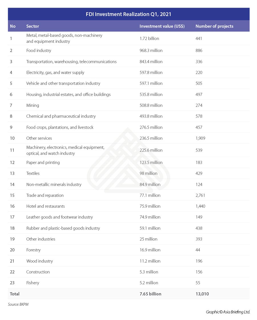 Total investment realization for Q1 of 2021 has seen an uptick compared to the same period in 2020. Between January and March, Indonesia saw a total investment realization of 219.7 trillion rupiah (US$15.20 billion), an increase of 4.3 percent, or 210.7 trillion (US$14.58 billion). This is already 25 percent of the government’s 2021 investment target.