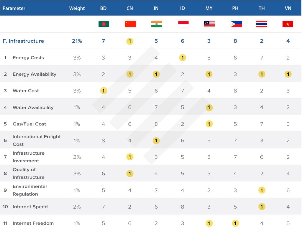 The EAMI index placed Malaysia’s infrastructure ranking as third from eighth. The country also ranked first for energy availability, first for water availability, and first for fuel costs.