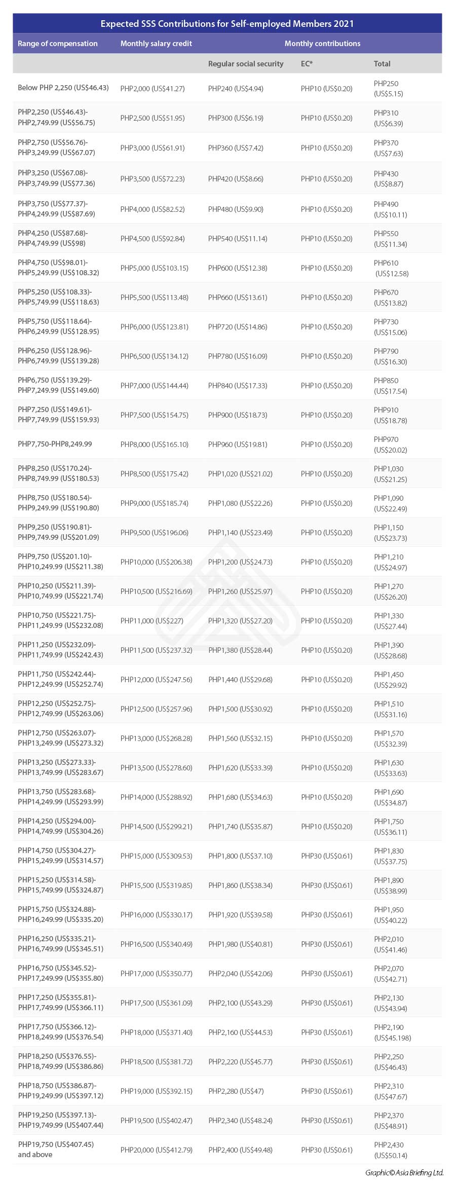 The contribution rate is also 12 percent and as of September 2020, the Employees’ Compensation Program was expanded to include self-employed SSS members.